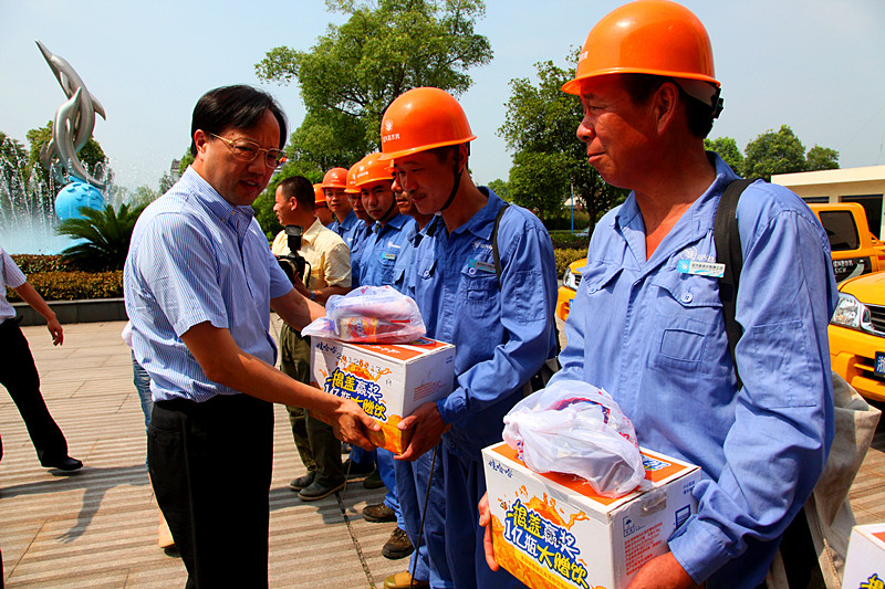 7月12日上午,縣委書記何加順、副縣長周樹森等領導在水務集團董事長倪阿泉、總經理單寶子等領導陪同下來到公司慰問在高溫下作業的供水一線職工,親手把防暑降溫慰問品送到他們手上,并再三叮囑有關人員落實好夏季高溫時段的防暑降溫措施,確保一線職工身體健康。