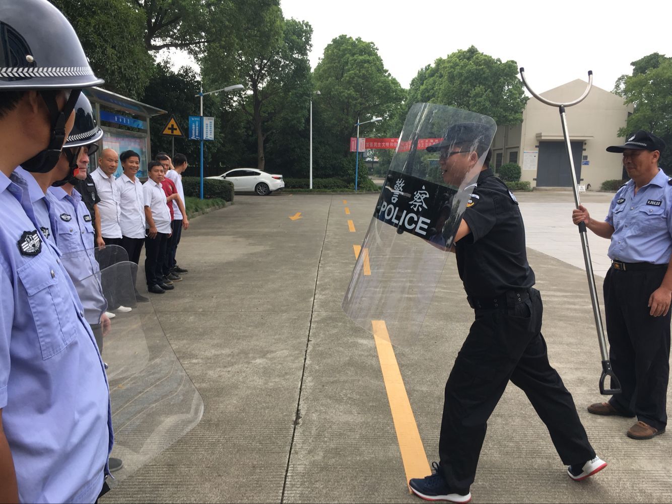 周大隊長從犯罪行為的特征分析、預(yù)防措施、實戰(zhàn)處置原則及方法等方面進(jìn)行了全面、詳細(xì)的講解,對盾牌、鋼叉等安保器材的使用方法和技巧進(jìn)行了詳細(xì)的演示和示范,并指導(dǎo)參訓(xùn)人員進(jìn)行了分組實操練習(xí)。
